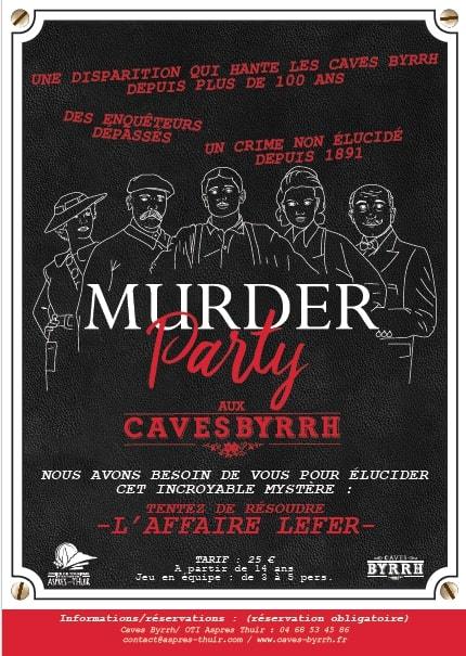 Vous allez adorer la Murder Party ! Une enquête criminelle passionnante au cœur des Caves Byrrh ! Venez résoudre l’enquête jamais résolue qui hante nos caves et Thuir depuis 1891!! Venez nous aider à comprendre grâce à votre sens de l’analyse ce qui est arrivé à un ingénieur des Caves Byrrh il y a plus de 100 ans ! En équipe vous devrez dompter les défis numériques et faire parler les hologrammes pour résoudre l’Affaire Lefer !